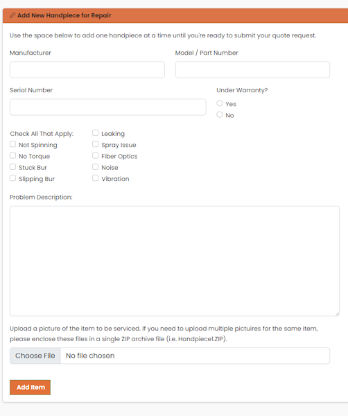 Gather the item(s) to be serviced and use our online quote request form to detail the services or repairs needed for each handpiece, and upload images of each item. Don't send us your item(s) until we have had a chance to respond to your submittal.